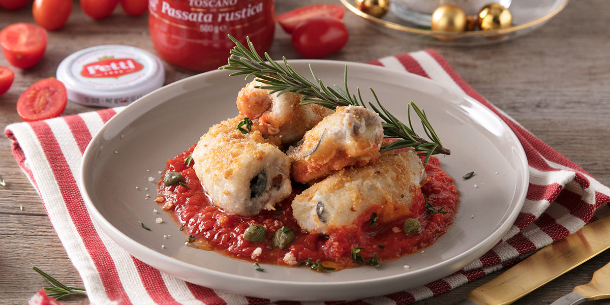 To prepare swordfish rolls, chop the onion finely and dice the celery heart, put them into a pan and add the olives, capers previously desalted in plenty of water and the Petti rustic sieved tomatoes - tomato purée. Season with salt and pepper and leave to cook for about 10 minutes over a low heat.