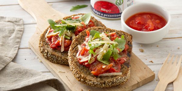 Lorsque ramolli, ajouter les tomates concassées "Il gran polposo" Petti, sel et poivre et laisser cuire pour 10 minutes. Pendant ce temps, frottez la fusée avec vos mains et faites griller les 4 tranches de pain. Servir les pain à l’ail savoureux et rustiques avec une base de tomate, de salade fusée, de ricotta salée râpée et d'huile d'olive crue.